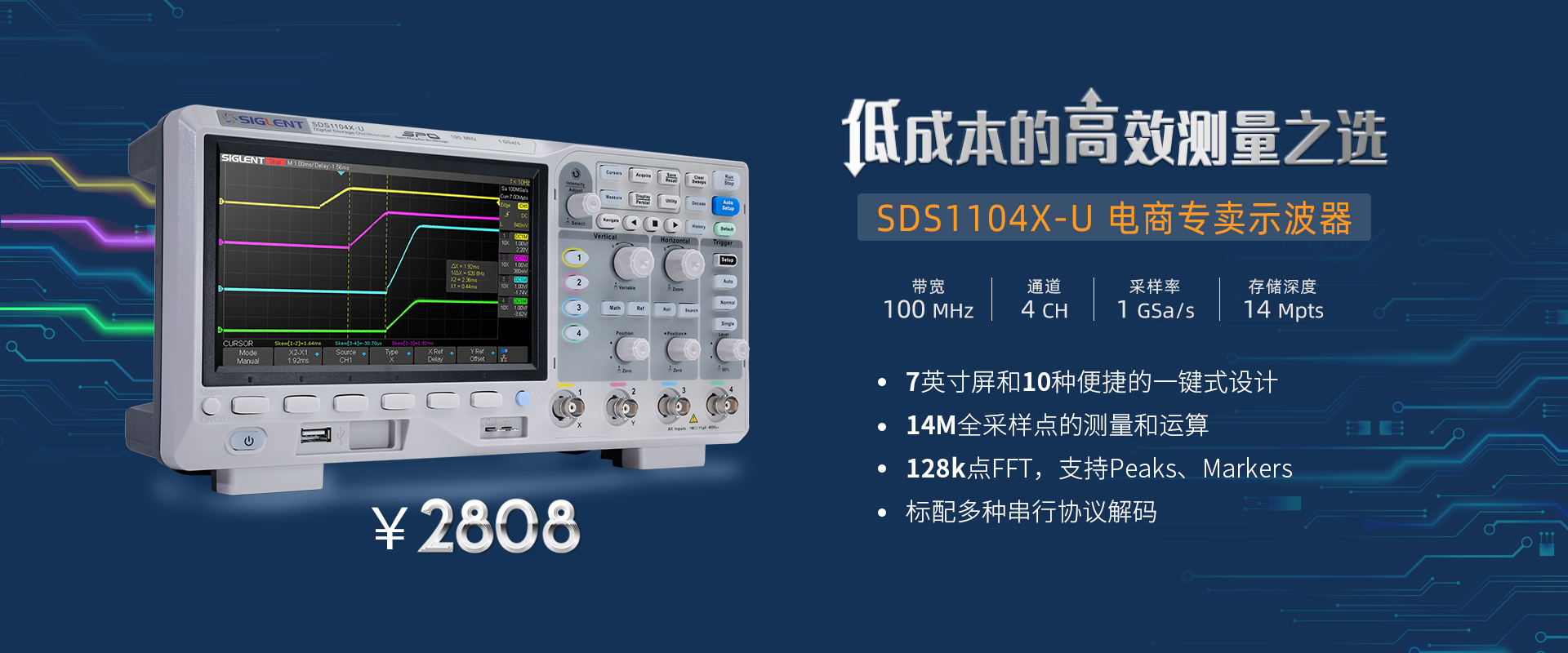 作為入門級(jí)數(shù)字示波器,SDS1104X-U帶寬100 MHz,采樣率1 GSa/s,能滿足工程師大部分的信號(hào)測(cè)量需求。10種便捷化一鍵操作,38種自動(dòng)測(cè)量功能,...